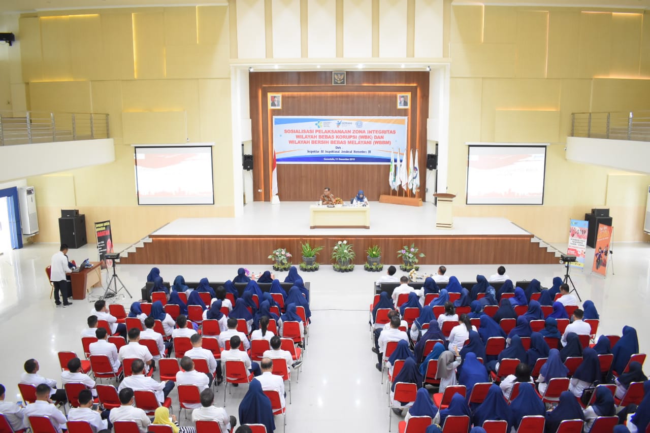Acara diawali dengan Sambutan dari Direktur Poltekkes Kemenkes Gorontalo ibu Dr. Dra. Henny PanaI, S.Kep, Ns, M.Pd Kegiatan yang berlangsung di gedung auditorium Poltekkes Kemenkes Gorontalo ini merupakan langkah konkrit dalam pelaksanaan program reformasi birokrasi, dan wujud tekad menolak upaya-upaya korupsi di lingkungan Poltekkes Kemenkes Gorontalo. Sosialisasi disampaikan langsung oleh Inspektur IV Inspektorat Jenderal Kemenkes RI bapak Alberthus Yudha Poerwadi, SE, Ak, M.Si, CA, CPMA dan dihadiri seluruh Civitas akademika Poltekkes Kemenkes Gorontalo.